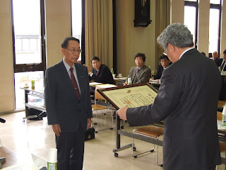 総会に先立ち、日本商工会議所通常会員総会において、役員議員の永年勤続20年表彰を受けられた監事の下口幸雄氏に、新家会頭が表彰状と記念品を伝達した。