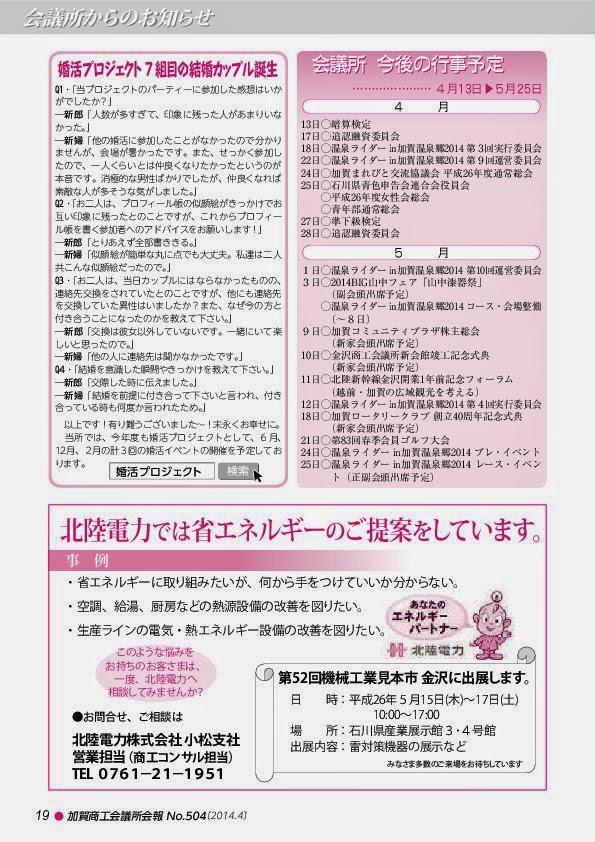 HOMEその他 当所では会員の皆様に行事やセミナーのご案内・ご報告、お店の紹介、補助金情報などを掲載した会報をお届けしております。 PDFデータを下記にて閲覧できます。(Google ドライブ) https://drive.google.com/file/d/0B5TloxqE8mzhT2RWTlRnVVFmdm8/edit?usp=sharing (T・I) 【婚活事業】7組目の結婚カップル誕生♡ 平成26年度事業者向け補助金セミナー