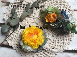 | 写真右上がヘアコーム、中央がコサージュのサンプルです |