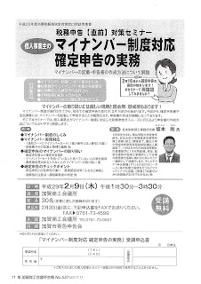 セミナータイトルは長いですが、「税務申告直前セミナー マイナンバー制度対応確定申告の実務」というもので、2/9(木)の13:30~15:30に当所にて開催されます。