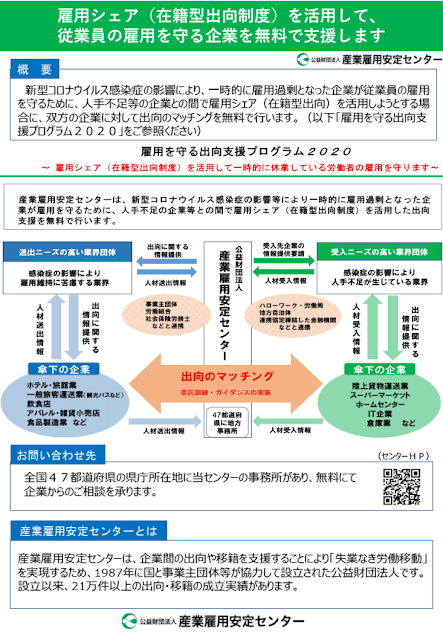 産業雇用安定センターでは、新型コロナウイルス感染症の影響によって一時的に雇用過剰となった企業が、従業員の雇用を守るために人手不足等の企業との間で雇用シェア(在籍型出向)を活用しようとする場合に、双方の企業に対して出向のマッチングを無料で支援する、「雇用を守る出向支援プログラム2020」を実施します。