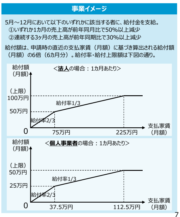 新型コロナウイルス感染症を契機とした5月の緊急事態宣言の延長等により、売上の急減に直面する事業者の事業継続を下支えするため、地代・家賃の負担を軽減することを目的として、テナント事業者に対して給付金を支給。