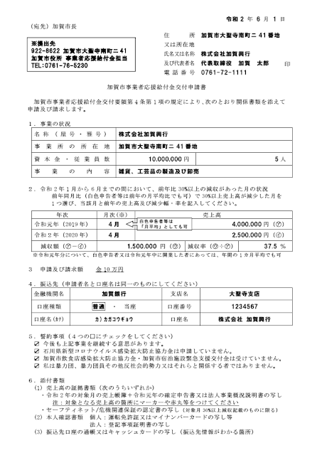 【送付先】〒922-8622 加賀市大聖寺南町ニ41番地 加賀市役所「事業者応援給付金担当」