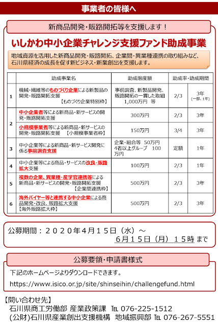 その取り組みの一環として、石川県及び公益財団法人石川県産業創出支援機構では、4月13日(月)より以下のとおり各種助成金(次世代産業創造ファンド等)の公募を開始いたします。