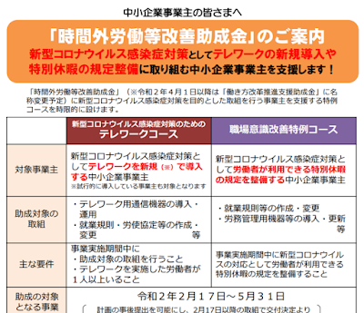 厚生労働省は、今般の新型コロナウイルス感染症対策として、中小企業事業主のテレワーク導入や特別休暇の規定整備を支援するため、既に今年度の申請の受付を終了していた時間外労働等改善助成金(テレワークコース、職場意識改善コース)について、特例的なコースを新たに設け、速やかに申請受付を開始することとしました。
