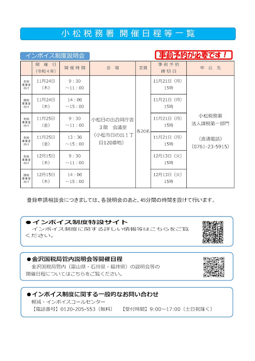 消費税の「インボイス制度説明会」及び「登録申請相談会」が開催されます
