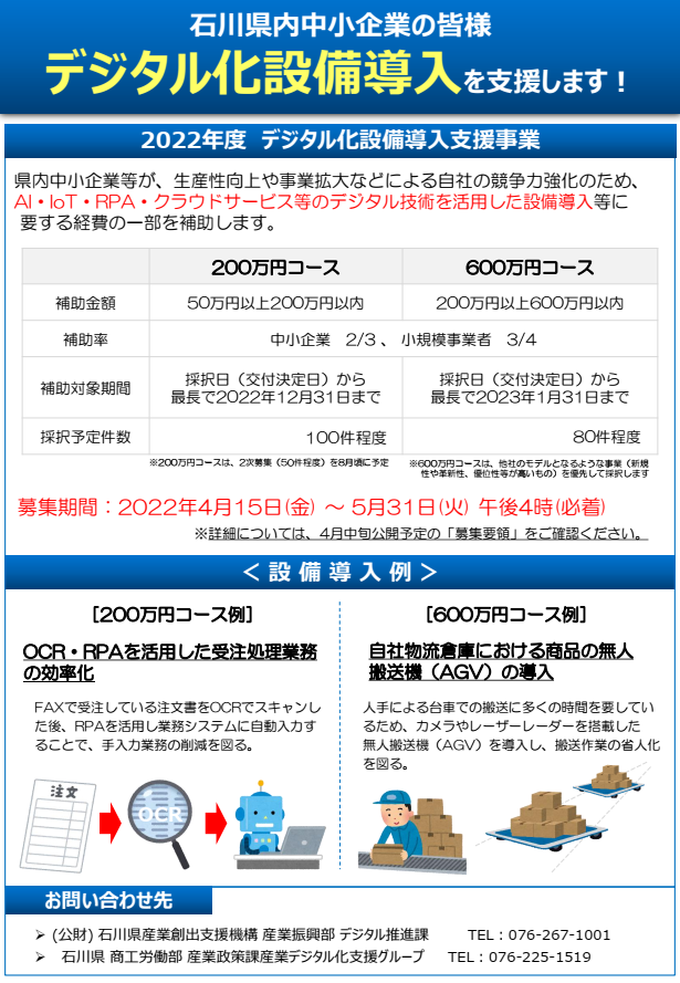 HOMEその他 加賀商工会議所では昨年度よりコロナの影響を受ける工芸品業界を情報発信で応援するため、 「職人のまち加賀」という事業をすすめています。 「加賀市では暮らしの中に自然に工芸が息づいている」をコンセプトに、食・人・スポットの主に3つに分けて市内会員企業を中心にご紹介しています。 →職人のまち加賀のHPはコチラ ******** 今回は、「旅行業が選ぶ人気温泉旅館ホテル250選”五つ星の宿”」に認定されている、 山中温泉の旅館「花紫」の取材記事を掲載しました。是非ご覧下さい。 →「花紫」の紹介ページはコチラ 令和4年度 研修助成金のご案内 (石川県)デジタル化設備導入支援事業補助金(締切5/31)