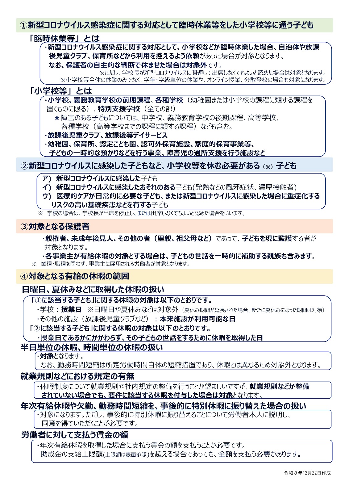 こうした状況をご理解いただき、労働者が希望に応じて休暇を取得できることが大切です。こうした環境づくりのため、特別の休暇を設けた際には、国の小学校休業等対応助成金を活用することが可能な場合もありますので、引き続き、特別休暇の新設や、既存の休暇制度を見直し、テレワークの促進についてもご検討いただきますよう、お願い申し上げます。
