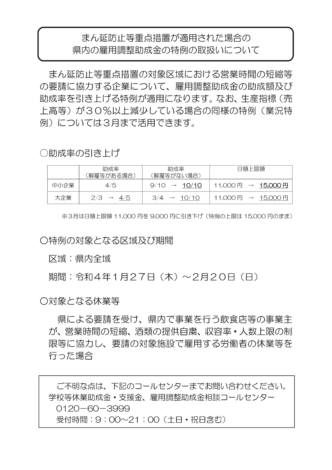 →「まん延防止等重点措置が適用された場合の県内の雇用調整助成金の特例の扱いについて」のチラシはコチラ。
