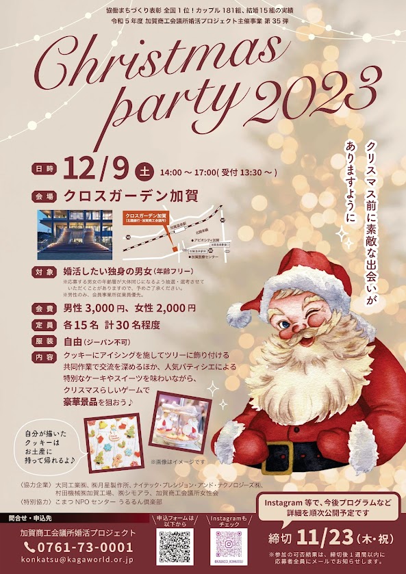 加賀商工会議所婚活プロジェクト主催の『ChristmasParty2023』の申込は11/23(祝)までとなっております☆彡