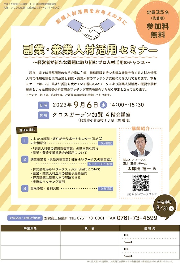 加賀商工会議所(創業塾係) TEL:0761-73-0001 FAX:0761-73-4599