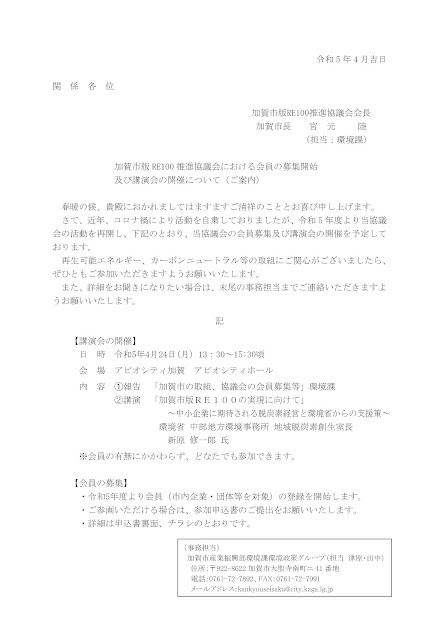 A.加賀市版RE100推進協議会事務局(加賀市産業振興部環境課)へ、別紙「会員申込書」を添付の上、原則メール(kankyouseisaku@city.kaga.lg.jp)にてお申し込みください。