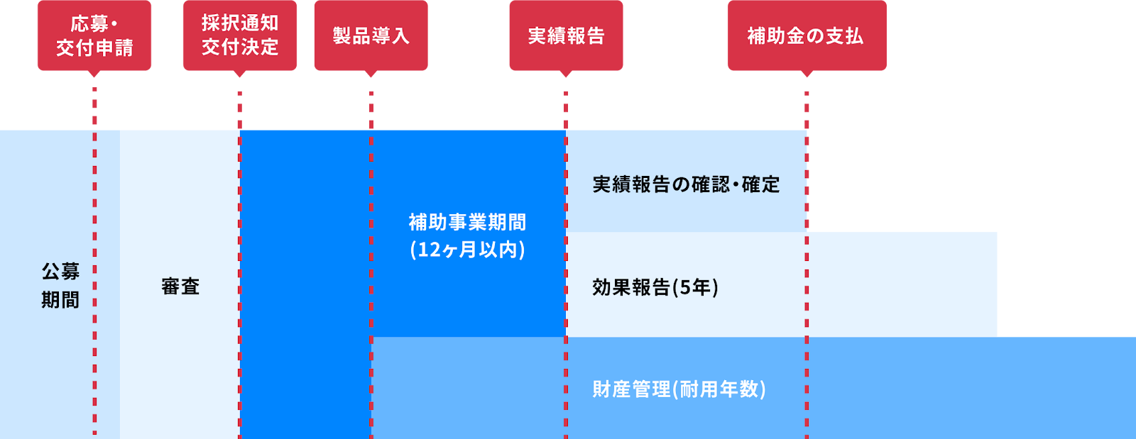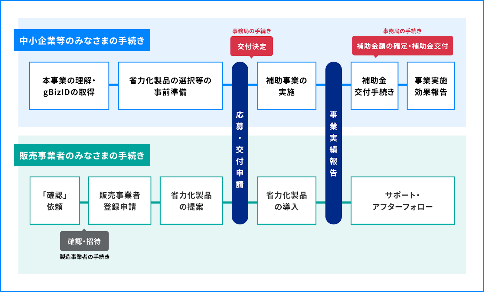 補助金申請は製品の販売事業者と共同で事業計画の策定が必要になり、中小企業等と販売事業者は共同事業実施者として公募期間内に販売事業者と共に申請受付システムで申請を行います。
