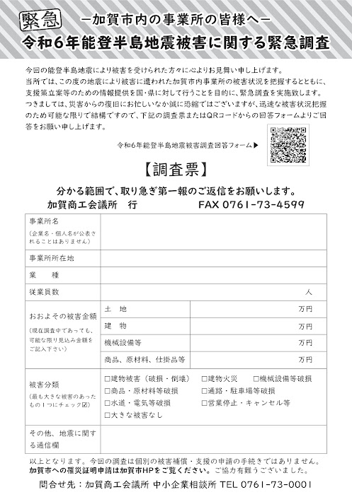 石川県から加賀市管内の事業所における地震による被害状況報告の依頼が加賀商工会議所にありました。