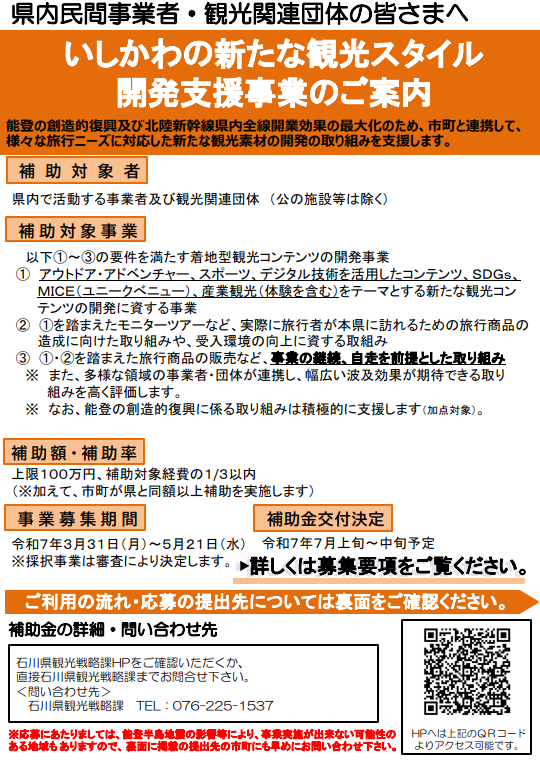 石川県の地域資源(後述)を活用した新商品・新サービス、または社会課題の解決に向けた新商品・新サービスの開発から販路開拓に要する事業に助成し、新ビジネスの創出をサポートします!