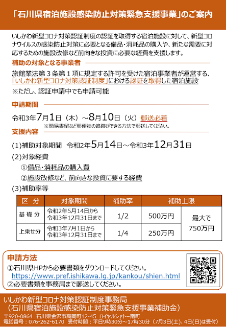 石川県宿泊施設感染防止対策緊急支援事業(補助金)(7/1~8/10)