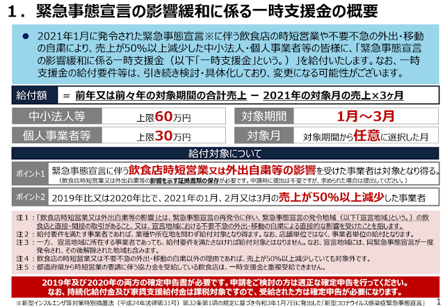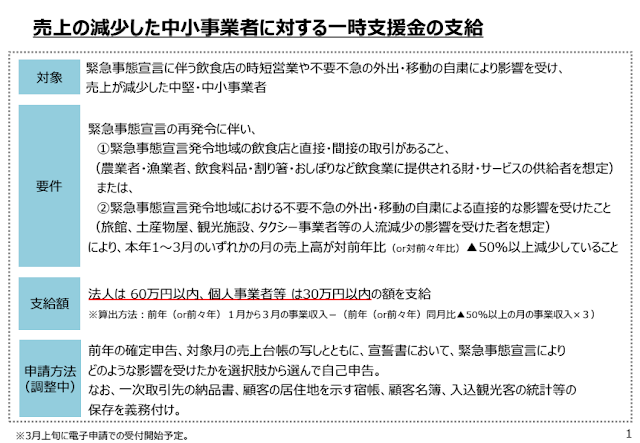 「売上の減少した中小事業者に対する一時金」(緊急事態宣言の再発令を受けた支援措置)について