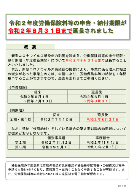 厚生労働省から労働保険等に関する期限延長の告知がありましたので、ご案内いたします。 1.労働保険の…