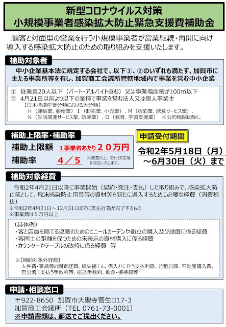 [2020/07/01追記]本補助金の応募受付は6月30日に終了し、あらたに「石川県感染拡大防止対策支援金」の募集…