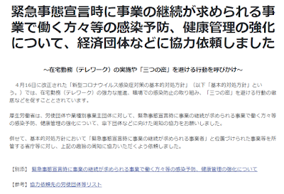 緊急事態宣言時に事業の継続が求められる事業で働く方々等の感染予防、健康管理の強化について(厚生労働省)