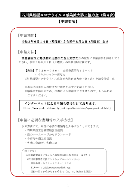 石川県新型コロナウイルス感染拡大防止協力金(第4次)について