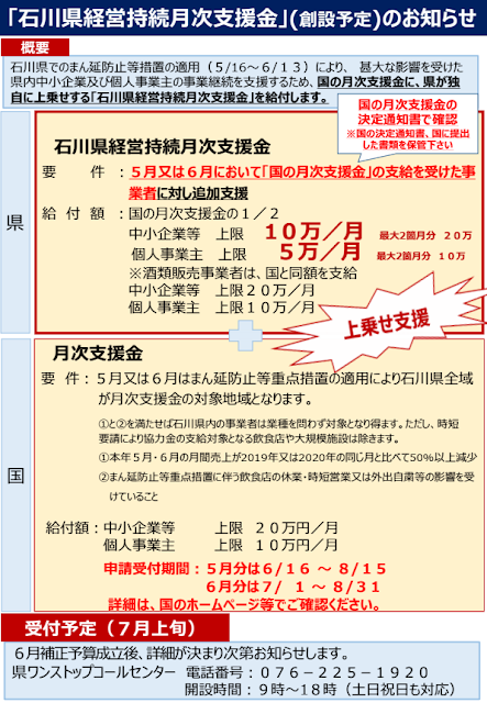 石川県経営持続月次支援金(月次支援金への上乗せ給付)の予告