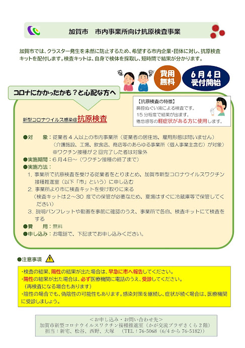 加賀市内事業所向け抗原検査事業開始(6/4~)のお知らせ