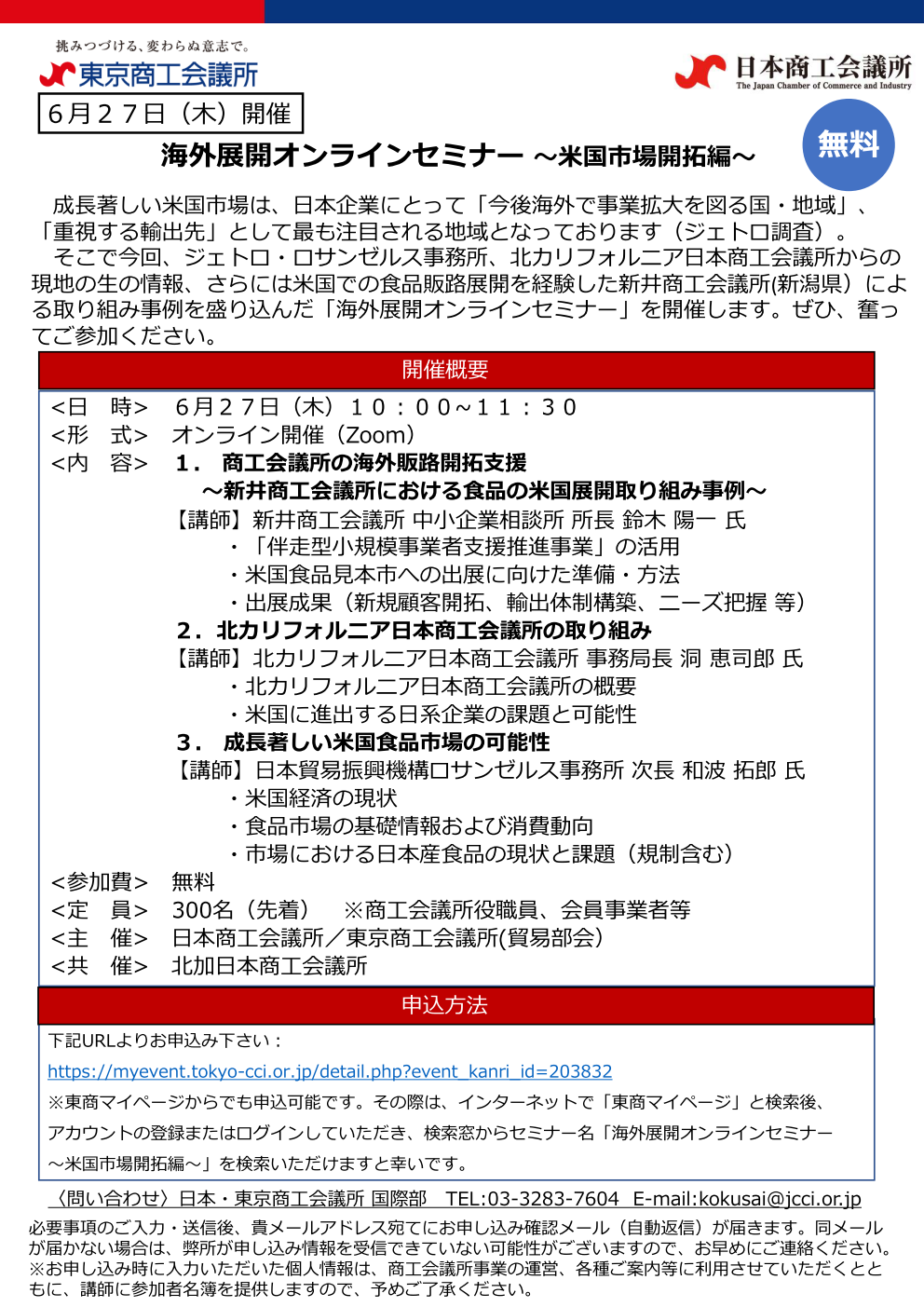 (6/27)「海外展開オンラインセミナー ~米国市場開拓編~」の開催について(日本商工会議所のお知らせ)