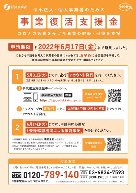 事業復活支援金の申請期限が延長(6/17まで)