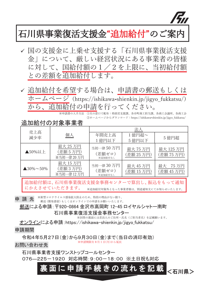 石川県事業復活支援金の「追加給付」の申請受付開始