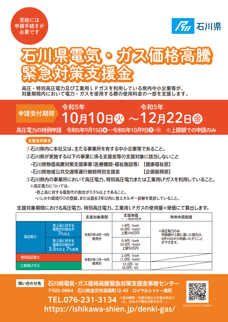 石川県電気・ガス価格高騰緊急対策支援金(受付締切12/22)