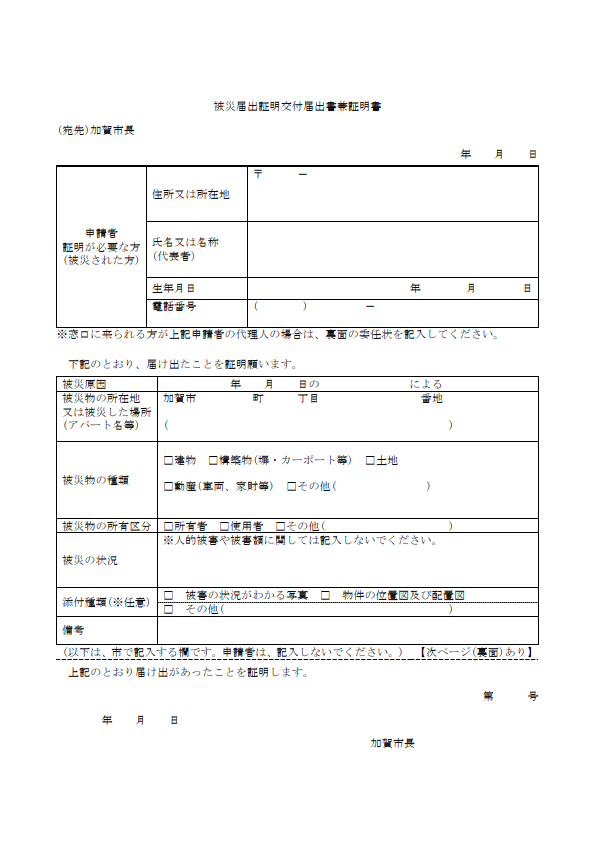 令和6年能登半島地震で事業用資産が被災したことを証明する「被災届出証明書」の受付は、加賀市役所に…