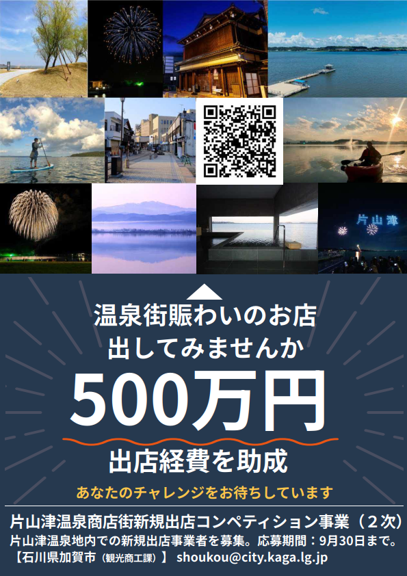 (最大500万円助成金)片山津温泉商店街新規出店コンペティション事業(第2次募集9/30締切)