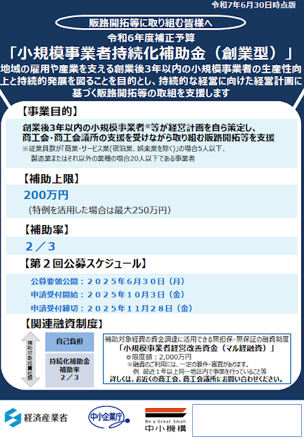「小規模事業者持続化補助金(創業型)」の第2回公募が開始され、公募要領、受付開始日と締切日等それ…